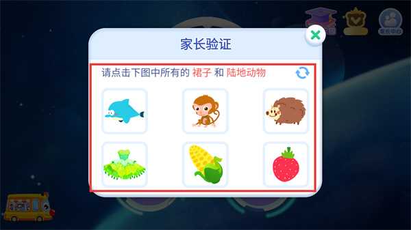 2、進(jìn)行【家長(zhǎng)驗(yàn)證】時(shí),需準(zhǔn)確識(shí)別并點(diǎn)擊圖中的【裙子】以及【猴子】、【刺猬】這類陸地動(dòng)物,完成驗(yàn)證方可繼續(xù)操作。