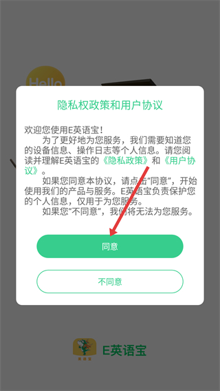1、面對【隱私權(quán)政策和用戶協(xié)議】彈窗,閱讀相關(guān)條款后點擊【同意】按鈕,完成授權(quán)以進(jìn)入E英語寶應(yīng)用使用功能。
