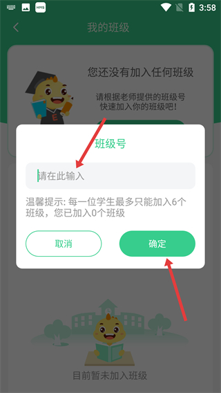 4、在彈出的班級號輸入框中,填寫老師提供的班級號后點擊【確定】按鈕,完成班級加入的申請操作。