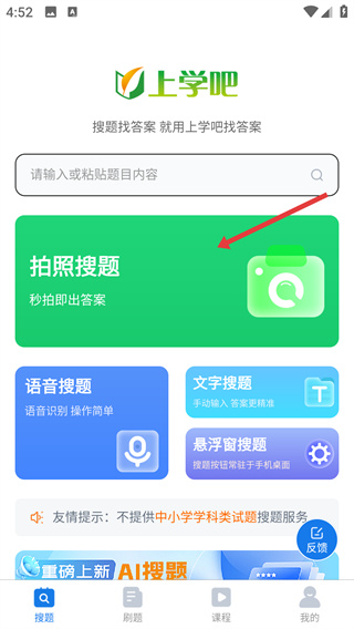 1、進入【上學吧】搜題頁,點擊【拍照搜題】的搜題方式。