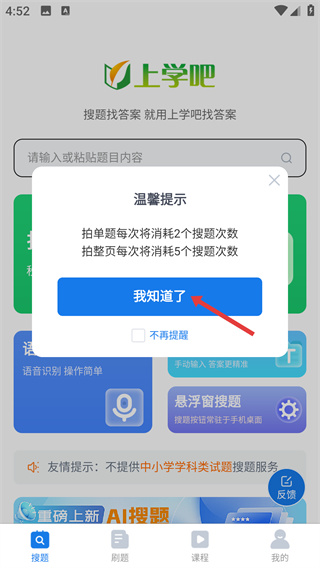 2、彈出【溫馨提示】,明確拍單題、整頁的搜題次數(shù)消耗規(guī)則,點擊【我知道了】繼續(xù)流程。