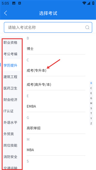 2、進(jìn)入【選擇考試】頁面,在左側(cè)分類選【學(xué)歷提升】,再從右側(cè)列表選【成考(專升本)】,快速定位目標(biāo)考試類型。
