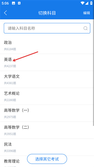 3、在【切換科目】頁面,選【英語】科目,科目后標(biāo)注題量便于參考練習(xí)方向。