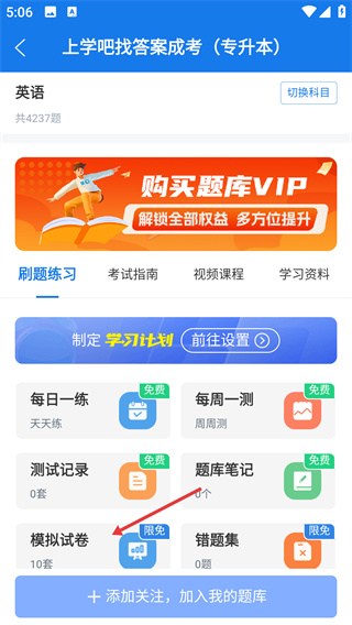 4、進(jìn)入【成考(專升本)-英語】刷題頁,可用【每日一練】-【模擬試卷】等功能練習(xí),部分功能限免,還能添加關(guān)注入題庫。
