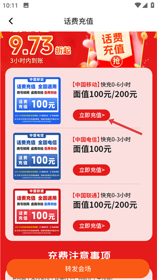 2、在【話費(fèi)充值】頁面,選擇對應(yīng)運(yùn)營商,點(diǎn)擊其下方的【立即充值】按鈕,進(jìn)入該運(yùn)營商的充值詳情頁。