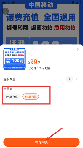 3、進(jìn)入【中國移動100元話費(fèi)充值】詳情頁,查看到賬時(shí)效、價(jià)格等信息后,點(diǎn)擊【領(lǐng)券購買】按鈕進(jìn)入購買確認(rèn)環(huán)節(jié)。