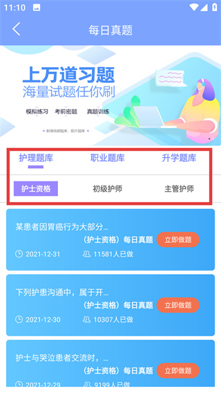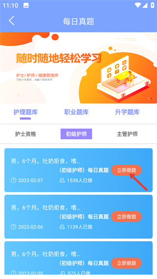 3、在【每日真題】頁面切換到【護(hù)理題庫】下的【初級護(hù)師】分類,點(diǎn)擊題目旁【立即做題】按鈕開啟對應(yīng)練習(xí)。