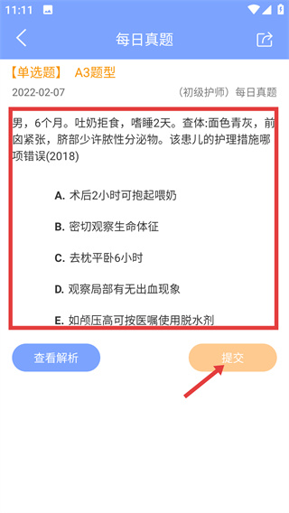 4、進(jìn)入題目作答頁面后,完成【單選題】-A3題型的選項選擇,點(diǎn)擊【提交】按鈕即可提交當(dāng)前題目的答案。