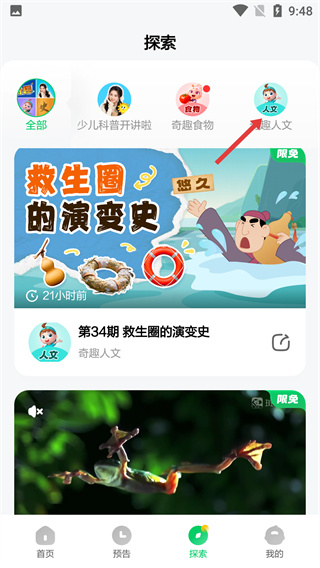 2、進(jìn)入探索頁(yè)面后,點(diǎn)擊頂部【奇趣人文】標(biāo)簽,可查看該分類下的內(nèi)容。