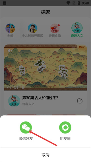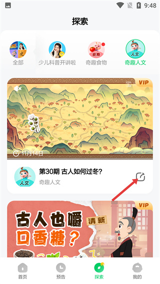 3、在探索的【奇趣人文】分類下,找到【第30期-古人如何過(guò)冬?】?jī)?nèi)容,點(diǎn)擊其右側(cè)分享按鈕可觸發(fā)分享選項(xiàng)彈窗。