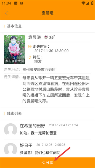 3、在兒童的詳情頁,查看基本信息、走失詳情等內(nèi)容后,點(diǎn)擊底部【分享】按鈕,彈出分享選項(xiàng)彈窗。