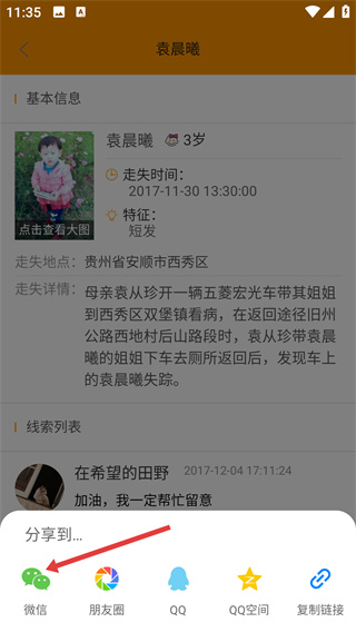 4、在分享選項(xiàng)彈窗中,選擇【微信】選項(xiàng),可將該失聯(lián)兒童信息分享至微信,助力擴(kuò)大信息傳播范圍。