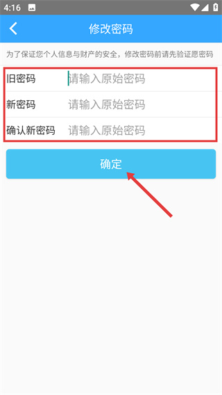 4、進入修改密碼頁面,依次輸入舊密碼、新密碼及確認(rèn)新密碼,點擊“確定”按鈕,完成賬號密碼的修改。