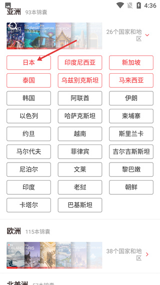 1、在亞洲區(qū)域的國家列表頁面,找到“日本”選項并點擊,進入日本對應的地區(qū)旅行指南列表頁面。
