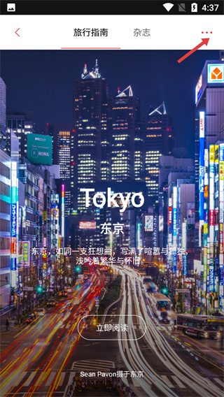 3、在東京旅行指南頁面,點擊右上角的三點按鈕,彈出包含分享、下載等功能的操作菜單。