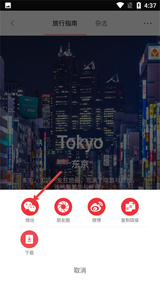 4、在彈出的操作菜單中,選擇“微信”選項,即可將東京旅行指南的內容分享至微信平臺。