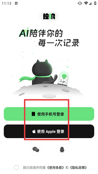 1、進(jìn)入【獨響】的登錄界面,可選【使用手機(jī)號登錄】或【使用Apple登錄】,需勾選協(xié)議完成登錄操作。
