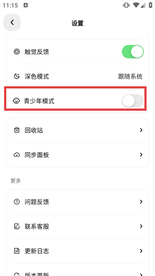 4、進(jìn)入【獨響】的設(shè)置界面,可見【觸覺反饋】-【深色模式】-【青少年模式】等選項,可操作【青少年模式】的開關(guān)功能。