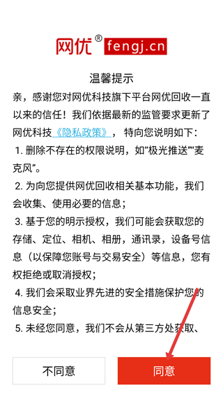 1、閱讀【網(wǎng)優(yōu)回收】的【隱私政策】溫馨提示,了解信息收集等規(guī)則后,點(diǎn)擊“同意”按鈕,進(jìn)入平臺(tái)頁(yè)面。