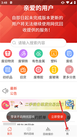 2、在【網(wǎng)優(yōu)回收】首頁(yè),可查看廢舊物資等分類入口,點(diǎn)擊底部“我”選項(xiàng),進(jìn)入個(gè)人相關(guān)功能頁(yè)面。