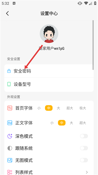 2、進入【設(shè)置中心】后,找到【安全密碼】選項并點擊,進入安全密碼相關(guān)的功能配置頁面。