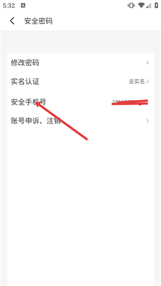 3、在【安全密碼】頁面,選擇【安全手機號】選項,進入對應(yīng)的【綁定手機】操作界面。