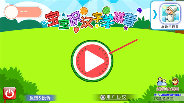 1、進(jìn)入【寶寶識(shí)漢字學(xué)拼音】頁(yè)面,點(diǎn)擊西瓜樣式的播放按鈕啟動(dòng)學(xué)習(xí)。