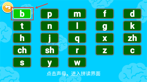3、在聲母選擇頁(yè),點(diǎn)擊【b】等聲母按鈕,即可進(jìn)入對(duì)應(yīng)的拼讀界面,開啟聲母相關(guān)的拼音學(xué)習(xí)練習(xí)。