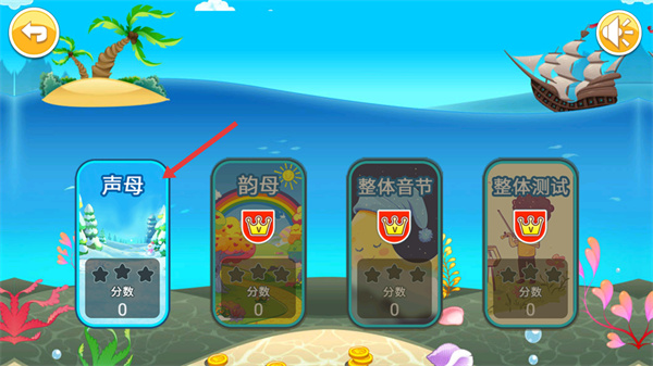 3、進(jìn)入測一測后,會看到【聲母】、【韻母】、【整體音節(jié)】、【整體測試】模塊,點擊【聲母】模塊開始對應(yīng)測試并記錄分?jǐn)?shù)。