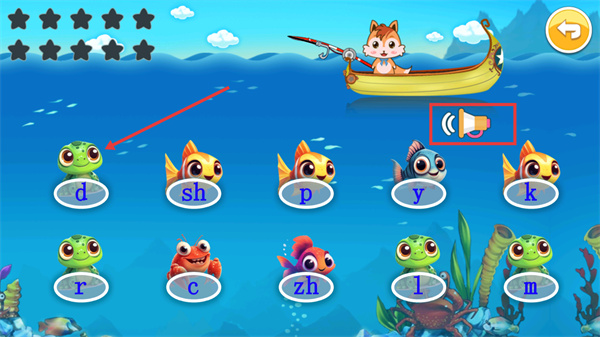 4、在聲母測試頁,通過喇叭聽發(fā)音,點擊帶【d】、【sh】等聲母的元素完成題目。