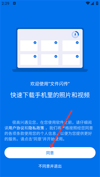 1、在“文件閃傳”的歡迎頁,閱讀用戶協(xié)議與隱私政策后,點擊【同意】按鈕,進入應(yīng)用的功能操作環(huán)節(jié)。