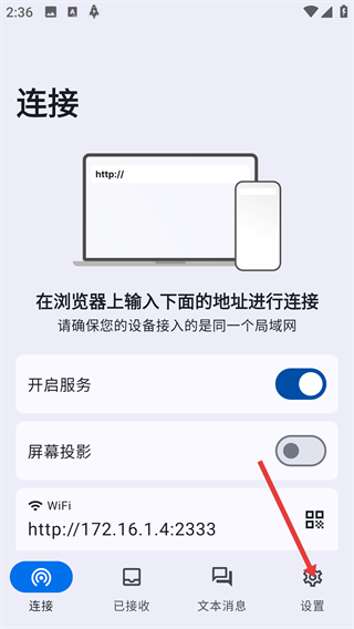2、進入“連接”頁面,確認(rèn)設(shè)備在同一局域網(wǎng)后,點擊底部導(dǎo)航欄的【設(shè)置】選項,進入應(yīng)用的設(shè)置配置界面。