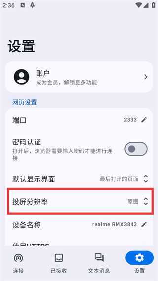 3、在設(shè)置頁面的網(wǎng)頁設(shè)置板塊中,找到【投屏分辨率】選項,當(dāng)前默認(rèn)選擇為“原圖”,點擊該選項可調(diào)整投屏畫質(zhì)。