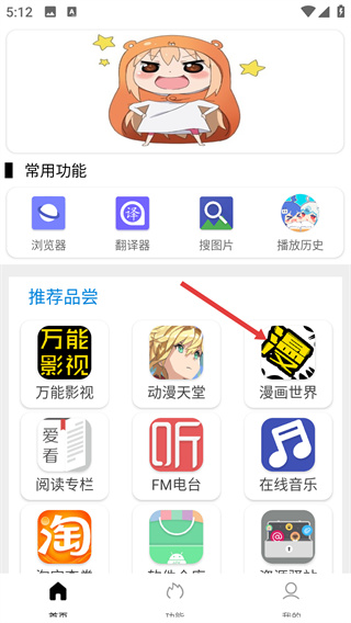 1、進(jìn)入主界面,在推薦品嘗板塊找到“漫畫世界”選項(xiàng)并點(diǎn)擊,進(jìn)入漫畫類功能頁面。
