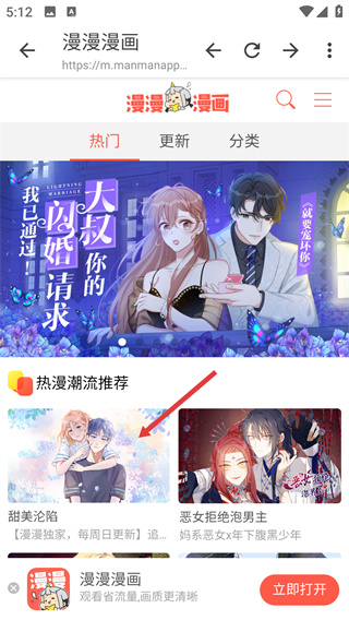 3、進(jìn)入具體漫畫平臺(tái)頁面后,在熱漫潮流推薦區(qū)域選擇想要閱讀的漫畫作品。