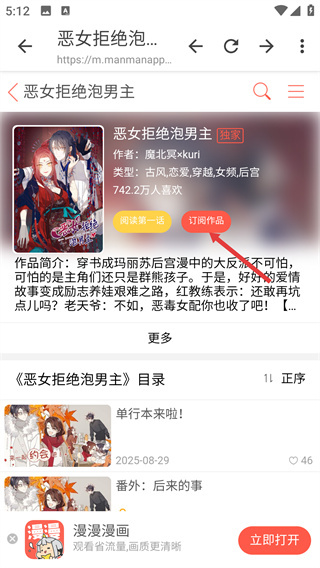 4、進(jìn)入漫畫作品詳情頁后,點(diǎn)擊“訂閱作品”按鈕,可及時(shí)獲取該作品的更新提醒。