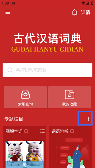 1、進(jìn)入古代漢語詞典首頁,點(diǎn)擊“專題欄目”右側(cè)的“+”按鈕,進(jìn)入學(xué)習(xí)欄目選擇界面。