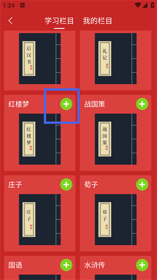 2、在學(xué)習(xí)欄目頁面,選擇目標(biāo)古籍(如《紅樓夢(mèng)》),點(diǎn)擊其對(duì)應(yīng)的“+”按鈕,將該古籍添加至專題欄目。