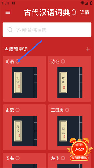 3、添加完成后返回首頁,在“古籍解字詞”板塊中選擇已添加的古籍(如《論語》),進(jìn)入該古籍的字詞解析頁面。