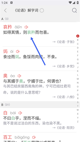 4、在古籍字詞解析頁面,可查看對(duì)應(yīng)古籍內(nèi)的字詞釋義、原文出處等內(nèi)容,如《論語》中“哀矜”“饐”等字詞的具體解釋。