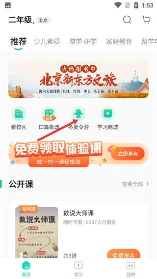 1、進入平臺首頁,找到【冬夏令營】功能入口并點擊,進入新東方文旅專屬頁面。