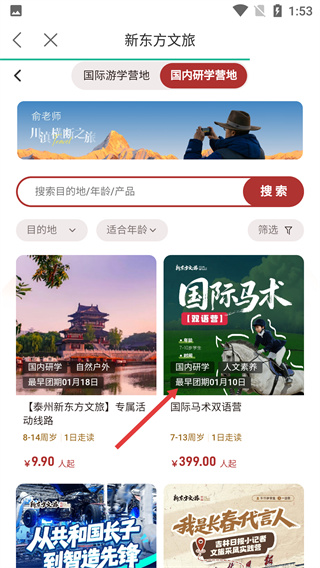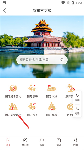 2、在新東方文旅頁面中,選擇【國內(nèi)研學(xué)營地】選項,進入國內(nèi)研學(xué)營地的項目列表頁面。