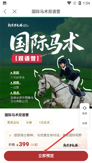 4、進入項目詳情頁確認(rèn)信息(年齡、時間、地點等)后,點擊【立即預(yù)定】按鈕,完成該研學(xué)項目的預(yù)訂操作。