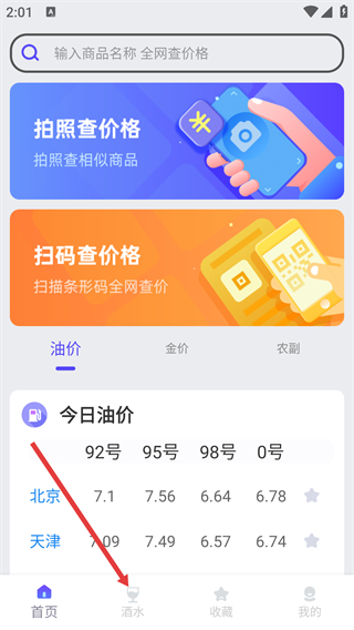 1、進(jìn)入首頁,查看“拍照查價格”“掃碼查價格”等功能后,點擊底部【酒水】選項,進(jìn)入查酒水的分類頁面。
