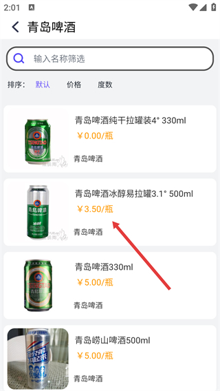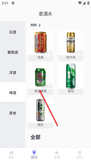 2、在查酒水頁面的左側(cè)分類中選擇【啤酒】,找到“青島啤酒”并點擊,進(jìn)入對應(yīng)產(chǎn)品的列表頁面。