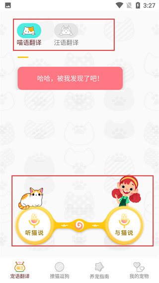 1、進入【寵語翻譯】頁面,選擇【喵語翻譯】(或汪語翻譯)分類,可通過“聽貓說”“與貓說”功能,實現(xiàn)與寵物的趣味語言互動。