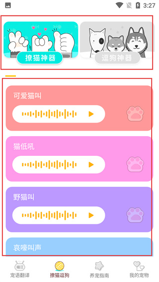 2、切換至【撩貓逗狗】頁面,選擇【撩貓神器】分類,點擊對應貓叫音頻的播放按鈕,利用音頻與貓咪互動。