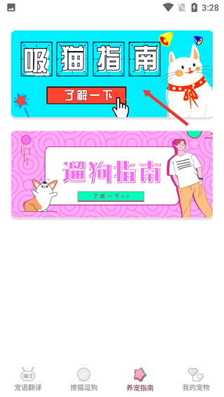 3、進入【養(yǎng)寵指南】頁面,點擊【吸貓指南】板塊的“了解一下”按鈕,進入吸貓指南的詳細內(nèi)容頁面。
