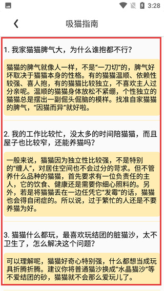 4、在吸貓指南頁面,查看養(yǎng)貓相關(guān)的常見問題解答,獲取科學養(yǎng)寵的知識參考。