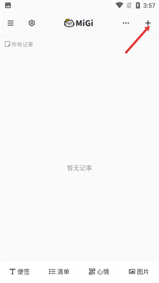 1、打開【Migi】應(yīng)用后,點擊頂部的【+】按鈕創(chuàng)建內(nèi)容。